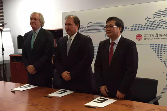 Carl P. Zeithaml, Dean of McIntire School of Commerce, University of Virginia, Josep Franch, Dean of ESADE Business School, and Prof. Xu Xinzhong, Dean of Lingnan (University) College, Sun Yat-sen University sign the agreement.