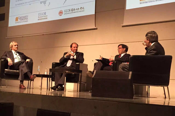 Carl P. Zeithaml, Dean of McIntire School of Commerce, University of Virginia, Josep Franch, Dean of ESADE Business School, and Prof. Xu Xinzhong, Dean of Lingnan (University) College, Sun Yat-sen University speak on the stage.