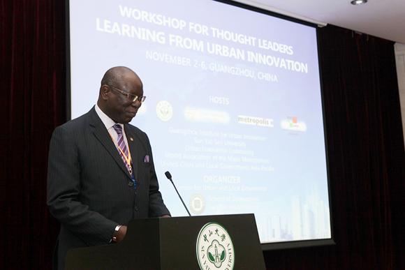 On November 2, 2015, the opening ceremony of the first Workshop for Thought Leaders: Learning from Urban Innovation took place in Sun Yat-sen University, Guangzhou. This workshop is committed to addressing global issues through urban innovation and establishing a global community of sharing experiences on urban governance for cities around the world. Officials of international organizations and local governments from 22 cities of 12 countries participated in this workshop. The workshop is co-hosted by Guangzhou Institute for Urban innovation, Sun Yat-sen University, Urban innovation Committee, UCLG ASPAC and the METROPOLIS, and is organized by Center of Urban and Local Governance, School of Government of Sun Yat-sen University.