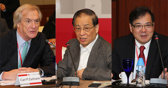 From left to right: Prof. Carl P. Zeithaml, Dean of McIntire School of Commerce, Prof. LIU Mingkang, Honorary Dean of Lingnan (University) College, and Prof. XU Xinzhong, Dean of Lingnan (University) College