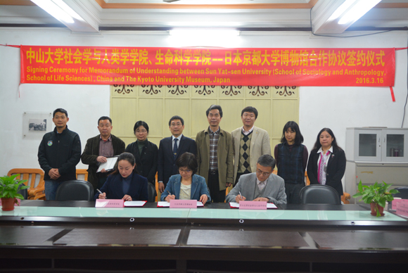 During March 15th and 18th, 2016, the School of Sociology and Anthropology and School of Life Sciences at Sun Yat-sen University (SYSU) signed the Memorandum of Understanding (MoU) in Martin Hall with the Kyoto University Museum. Prof. Naoko Iwasaki (the president of the Kyoto University Museum), Prof. Yingqiang Zhang (the dean of the School of Sociology and Anthropology at SYSU), and Prof. Yan Zhang, (the deputy dean of the School of Life Sciences at SYSU) exchanged the memorandums representing the three parties involved. Other attendees of the meeting included Associate Professor Masaharu Motokawa, Associate Professor Yumiko Murakami, researcher Hiroko Hashimoto from the Kyoto University Museum, Prof. Wensheng Shu from the School of Life Sciences at SYSU, Prof. Hong Pang and Prof. Pengfei Fan from the Biology Museum at SYSU, Prof. Zhiyang Liu and Prof. Peng Zhang from the School of Sociology and Anthropology at SYSU.