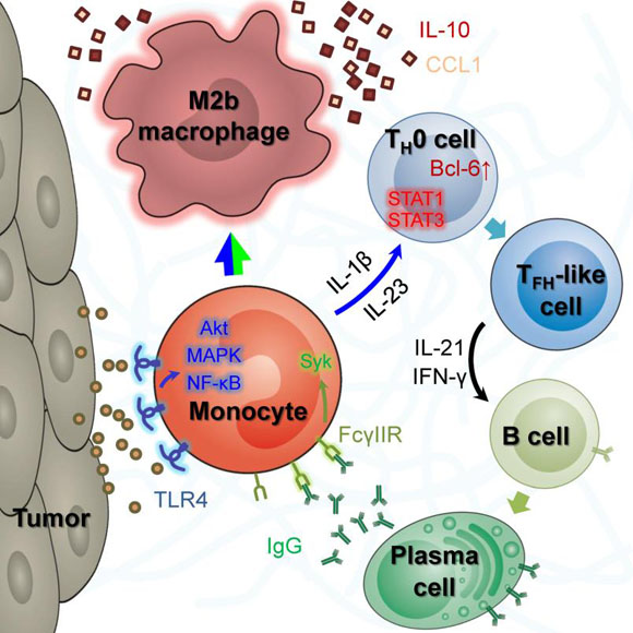 FH cells), a series of responses similar but not identical to those in the lymph node. Intriguingly, these responses were found initiated by tumor-activated monocytes and in turn led to M2b-type polarization of monocytes/macrophages, hence forming an adaptive “bridge” that linked two innate processes and eventually resulted in tumor progression.