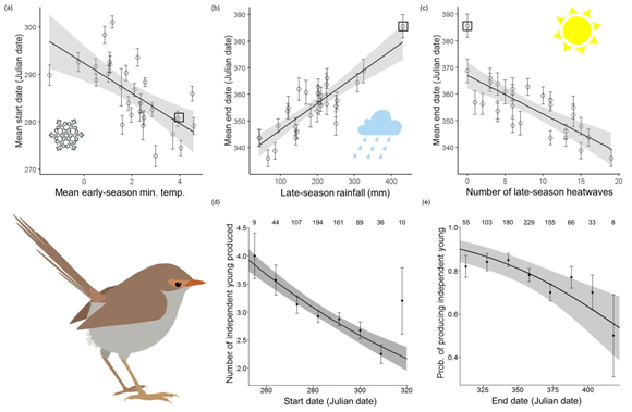 Global Change Biology. This study used 28 years of field data from south-eastern Australia to investigate the links between climate, timing of breeding, and breeding success in a cooperatively-breeding passerine, the superb fairy-wren (