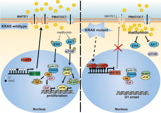 KRAS oncoprotein hypermethylates and silences the expression of multidrug and toxic compound extrusion 1 (MATE1), a specific pump that expels metformin from the tumor cells by upregulating DNA methyltransferase 1 (DNMT1). The present findings provide evidence that