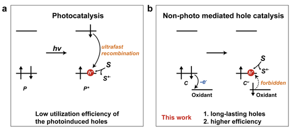 Figure 1. Functional principles of electron transfer in (a) light-induced photocatalytic system; (b) Proposed non-photo mediated hole catalytic system.