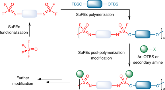 4 (Figure 1). One feature of this polymerizaiton reaction is that there are two S–F bonds on each side of the iminosulfur oxydifluoride monomer. After one S–F bond is reacted during the polymerization process, the remaining one will be less active. Therefore, one S–F bond can be reacted with high selectivity, avoiding uncontrollable cross-linking reaction. The remaining S–F bond can also be reacted with aryl silyl ether further with a more efficient BEMP catalyst, or with a secondary amine in the presence of a base if needed to form S–O and S–N bonds respectively, thereby facilitating the preparation of well-distributed and highly branched polymers. Various functional molecules can be easily installed on this polymer and to form diversified functional polymers quickly. NMR experiment showed that N=SOF