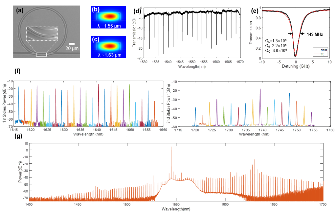 Fig. 2. Engineered Raman lasing dynamics in different microresonators. (a)-(e) High-Q microring resonators. (f) Cascaded Raman lasering. (g) Broadband Raman-Kerr comb