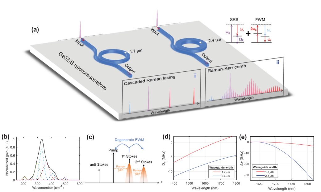 To address the challenges mentioned above, the research group has built a home-developed chalcogenide glasses (GeSbS) integrated photonics platform. This platform features low loss, high Kerr nonlinearity, strong Raman gain, flexible dispersion engineering, and silicon-based integration compatibility, which is attractive to realize the high performance of on-chip Raman laser. In this work, for the first time, they proposed that the interplay between Raman and Kerr processes in the integrated microresonators can be proactively manipulated through the group velocity dispersion engineering. They have demonstrated highly-efficient cascaded Raman lasing and broadband Raman-Kerr comb in different microresonators, as shown in Fig. 1(a). By taking advantage of semiconductor processing technology, they realized the precise waveguide structure and the higher quality factor of chalcogenide microresonators. Thus, the flexible outputs between the cascaded Raman laser and the broadband Raman-Kerr frequency comb are obtained. In the experiment, they achieved a cascaded Raman laser with low pump threshold power of 3.5 mW in device i, and a Raman-Kerr comb with a bandwidth of over 200 nm in device ii. Furthermore, they also established a model considering both Raman gain and Kerr nonlinearity to numerically simulate this peculiar phenomenon. The accuracy of the design and experimental results are further theoretically verified, see Fig. 2.