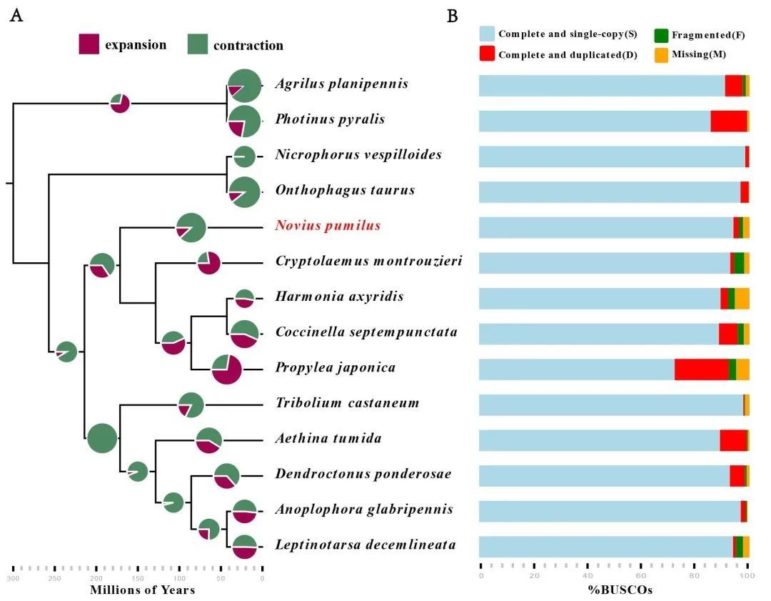 Figure 2 Evolution of genes families and estimated completeness of the gene sets of 14 insect species. (A) Average expansion/contraction (radius of node circles), where for each circle, purple highlights the percentage of expanded gene families, and green highlights the percentage of contracted gene families. (B) Completeness of official gene sets of each insect species were assessed by applying the BUSCO pipeline