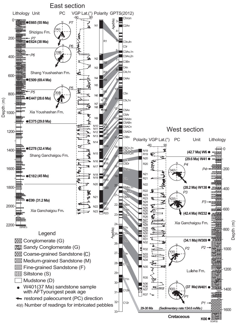 Our sampled sections are referred to as the Hongshan West and the Hongshan East sections, which are exposed in the north and south flanks of a syncline, respectively, related to the NQTB (Fig. 1C). Based on magnetostratigraphies combined with detrital apatite fission-track ages, we date the basin fills to be from ca. 30 to 4.8 Ma (Fig. 2).