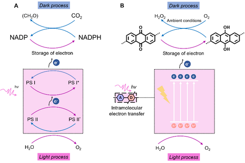 Figure. The mechanism behind photosynthesis of H2O2 by TPE-AQ. (A) The electron transfer and storage strategies in photosynthesis in green plants. (B) The electron transfer and storage strategies in the TPE-AQ system.
