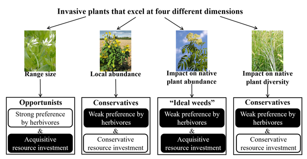 In this study, a dataset of leaf traits and four dimensions of invasion success (i.e., range size, local abundance, impact on native plant abundance, and impact on native plant diversity) were compiled for 395 non-native plant species in the US and Europe to explore associations between leaf traits and dimensions. According to the results, different dimensions of invasion success did not always covary; and they were associated with different functional traits (Fig. 1). Invasion success at the regional scale was related to traits that promote rapid colonization; whereas invasion success at the local scale was related to traits that are potentially less preferred by herbivores. There was only one category where successful invaders met our expectation of “ideal weeds”, and that was where they have a strong impact on native plant abundance. Some locally successful invaders even possessed traits that facilitate a high stress tolerance and conservative strategy, which were similar to locally abundant native species.