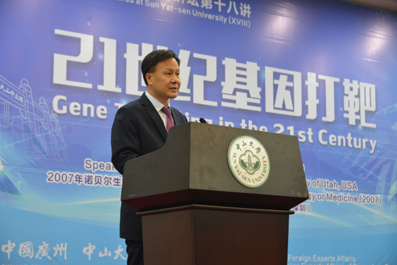 On November 7, 2017, the 18th Session of Nobel Laureates Series Lectures at Sun Yat-sen University organized by the State Administration of Foreign Experts Affairs, the Administration of Foreign Experts Affairs of Guangdong Province, and Sun Yat-sen University was held in Swasey Hall on Guangzhou South Campus. Professor Mario Capecchi, winner of the Nobel Prize in Physiology or Medicine in 2007, was invited to give a lecture entitled “Gene Targeting in the 21st Century”.