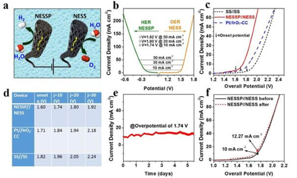 (2) Excellent performance: Due to the increase in active specific surface area originated from the etching and doped N/P element from the annealing under gases, the N, P-active electrode performances is comparable to Pt for the hydrogen evolution activity, and the N-active electrode is better than IrOxon oxygen evolution. The water splitting device assembled with the N and P active electrode notably outperformed that of the conventional Pt-IrOxsystem. It also possesses a narrower overpotential.