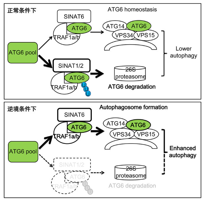 As the protective mechanism in plant response to stress, the scientists knew little about the regulation mechanism of plant autophagy. The team of Prof. Shi Xiao screened two TRAF domain containing proteins named TRAF1a and TRAF1b translocated from the cytoplasm to the autophagosome-related structures under starvation conditions by fused them to GFP for transient expression in Arabidopsis protoplasts and confocal laser scanning microscopy analysis. Plants lacking of TRAF1a and TRAF1b altered sensitivity to biotic and abiotic stress including hypoxic stress, indicating that TRAF1a and TRAF1b invoveled in autophagy via the posttranslational modification of the autophagy related protein. Genetic and biochemical evidence showed that TRAF1a and TRAF1b as molecular adapters, recruit different E3 ligase SINAT1 and SINAT2 to ubiquitinate and degrade of ATG6 under normal condition or SINAT6 to maintain ATG6 homeostasis by competitively associating with ATG6 under starvation condition to ragulate the dynamic of autophagy (Figure 1). This finding with important scientific significance provides a new research direction of regulation mechanism for further research on plant autophagy.