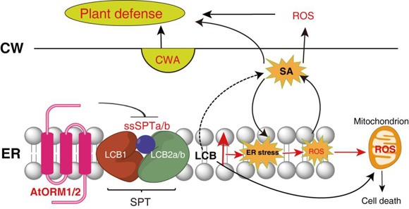 Sphingolipids are essential components of cellular membranes and play pivotal roles as bioactive molecules involved in signal transduction and cell regulation, and in a wide range of other biological processes, including secretion, programmed cell death, autophagy and stress responses (Bi et al., 2014; Wu et al., 2015). Serine palmitoyltransferase (SPT) is the first and rate limiting enzyme in sphingolipids synthesis which is regulated by orosomucoids (ORM) proteins in human and yeasts. However, the function of ORMs is not well understood in plants. They found that plant ORMs physically interact with the small subunit of SPT (ssSPT) and inhibit SPT complex activity. Ablation of ORMs stimulated the de novo sphingolipid biosynthesis, enhanced resistance to oxidative stress and pathogen infection and exhibited an early senescence phenotype. This study indicates that ORMs interact with SPT to regulate sphingolipid homeostasis and play a pivotal role in environmental stress tolerance in plants.