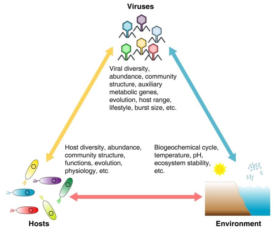 At the end of the 19th century, the European scientists discovered the first virus which causes mosaic-like mottling and discoloration on the leaves of tobacco, hence being named as Tobacco mosaic virus (TMV). Since then, the biological triangle of virus, host and the environment was born and has attracted a great deal of interests from the scientists (Figure 1). Historically, our understanding of viral diversity was hampered by the difficulties in isolating viruses as well as the mosaic nature of viral genomes. More recently, meta-omics approaches have been applied to explore the viral ecology in nature. In the last two decades, the diversity, community composition, and also the ecological functions of viruses (mainly phages) in diverse habitats have been revealed by using the sequencing technologies (metagenomics and metaviromics) and theoretical methods (ecology, biogeochemistry, and bioinformatics). However, the biogeographic study of natural viral communities has largely lagged behind their prokaryotic counterparts. Our current understanding of viral biogeography stems from several pioneer studies in marine environments. Therefore, further study of the distribution patterns and the biotic and abiotic drivers of natural viral communities should provide new insights into the viral biogeography.
