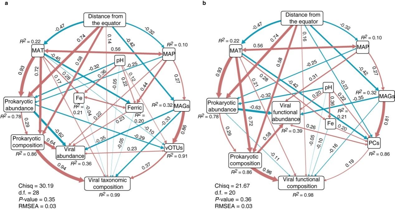 Figure 2. Structural equation modelings showing direct and indirect effects of biotic and abiotic variables on viral communities
