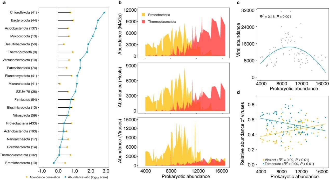 The researchers revealed that viral taxonomic and functional richness follow the latitudinal diversity gradient paradigsm, in general agreement with the diversity patterns of other domains of life. They also identified ferric iron concentration as the most important environmental factor governing viral abundances in the AMD sediments, reminiscent of the Ferrojan Horse hypothesis. For the viral community structure, the analyses revealed a scale-dependent distance-decay distribution of viral taxonomic and functional composition, which are directly and primarily affected by prokaryotic assemblages and indirectly driven by latitude, mean annual temperature and pH (Figure 2). Results also highlighted lineage-specific virus-host abundance ratios that cause a nonlinear and polynomial relationship between total viral abundance and host abundance, and richness-dependent virus-host interaction structure which implies underlying viral infection and host defence mechanisms in natural environments (Figure 3). Finally, their analyses identified a set of pho regulon genes (i.e., phoH and phnCDE) in the predicted viral genomes, and observed dynamic response of gene abundance to the availability of phosphorus in the sediments, indicating an potential important roles of these viruses in phosphorus assimilation for their hosts.