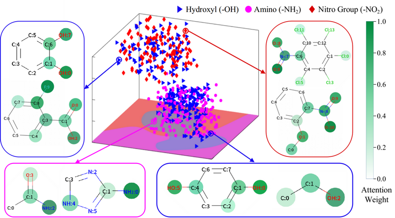 Fig 4. The t-SNE reduces the high-dimensional context vectors of the three substructures to the 3D embedding space and visualizes the attention weights learned from the Mol2Context-vec model for eight molecules.