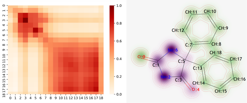 Fig 3. Chemical intuitive explanation of Mol2Context-vec on phenytoin. (a) The heat map of Phenytoin’s atomic similarity matrix. (b) The contribution visualization of each atom in the phenytoin molecular structure to the solubility.