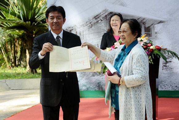 The opening ceremony of Mr. Chen Xujing’s former residence was held at the eastern square of the library on South Campus of Sun Yat-sen University on the morning of November 6. Attendees included Chen Chunsheng, Executive Deputy Secretary and Vice President of SYSU, Li Ping, Deputy Secretary of SYSU, Zhang Zhanxia, former Vice Chairman of Guangdong Political Consultative Conference and Chairman of Alumni Association of Lingnan College, Lu Yonggen, former President of South China Agricultural University and Academician of the Chinese Academy of Sciences, Li Baojian, former Vice President of Sun Yat-sen University and Chairman of Guangzhou Alumni Association of Lingnan College, Cheng Huanwen, Director of Sun Yat-sen University Libraries, Zhang Wenbiao, Secretary of Lingnan College, Shao Dongfang, Asian Division Chief of US Library of Congress, Qiu Qi, East Asia Library Operations Manager at Stanford University, friends of Mr. Chen Xujing, representatives of Mr. Chen Xujing’s family Ms. Chen Suixian, Mr. Chen Qijin, and Ms. Chen Yuxian. The ceremony was presided over by Deputy Secretary Li Ping.
