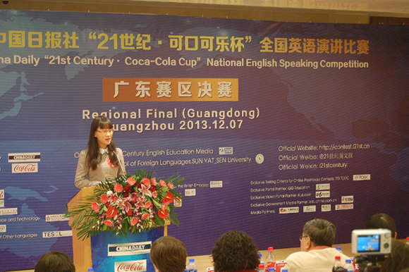 On December 7, 2013, the 19th China Daily “21st Century Coca-Cola Cup” National English Speaking Competition Regional Final (Guangdong) was held in School of Foreign Languages (FLS) Building, Sun Yat-sen University. The event was organized by FLS, and co-sponsored by China Daily and Coca-Cola. Ms. Luo Jiahui, a freshman from Department of English at FLS was awarded the first runner-up in recognition of her excellent performance in the competition.