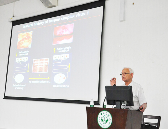 On the afternoon of June 12, the first issue of SYSU International Masters Frontiers Forum sponsored by Office of International Cooperation & Exchange was held on Zhuhai Campus. The forum invited Prof. Bernard Roizman, Member of National Academy of Sciences in the United States, as the speaker, and was chaired by Prof. Yan Guangmei, Vice President of SYSU. Prof. Ling Wenhua, Director of Office of International Cooperation & Exchange; Mr. Lin Junhong, Deputy Secretary of Party Working Committee of Zhuhai Campus; Mr. Li Guangjun, Deputy Secretary of The Fifth Affiliated Hospital; and faculty and students from The Fifth Affiliated Hospital, School of Marine Sciences and School of International Studies, a total of nearly 300 people attended the forum.