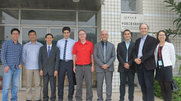 On March 25, 2015, Mr. Dominique Ochem, the nuclear counselor from French Embassy in China, visited the Sino-French Institute of Nuclear Engineering and Technology (IFCEN) at Sun Yat-sen University. French Dean of IFCEN Mr. Jean-Marie Bourgeois-Demersay and Deputy Dean of IFCEN Ms. Yu Zhantao warmly welcomed Mr. Ochem as well as his colleagues, and showed them around Zhuhai Campus, including the teaching facilities and research laboratories of IFCEN.