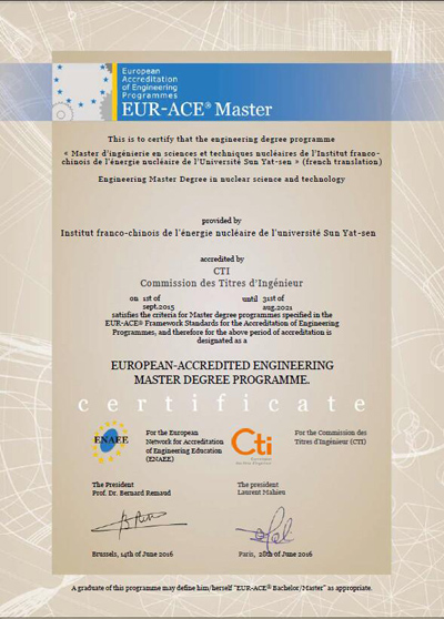 Recently, the Sino-French Institute of Nuclear Engineering and Technology (IFCEN) at Sun Yat-sen University successfully obtained the EUR-ACE (EURopean ACcredited Engineer) certificate. It gives IFCEN verification of high quality engineering education which meets the quality standards set by the engineering profession, and it also means IFCEN's qualified graduates meet the high European and international standards and are recognised by employers in Europe.