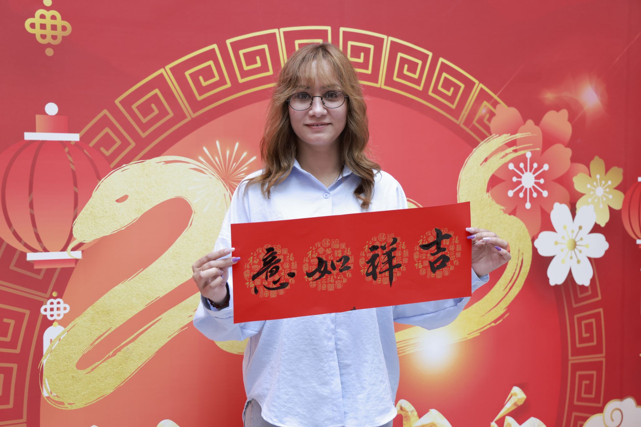 During the celebration event, students experienced traditional Spring Festival culture through activities such as writing Spring Festival couplets (chunlian), as well as writing the Chinese character fu, which means happiness and luck, on red paper.