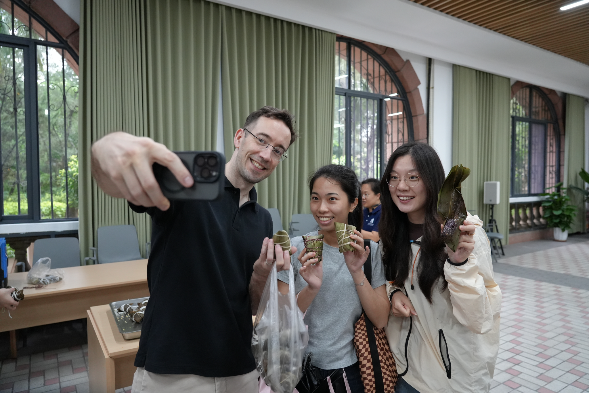 Staff and students are participating in the zongzi-wrapping activity.