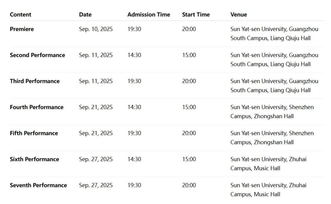 Looking ahead, Xia’s Legacy will continue its tour across SYSU’s campuses in Guangzhou, Zhuhai, and Shenzhen. It also scheduled to perform at Zhuhai Huafa International Grand Theatre, with plans for additional shows in Hong Kong and Macau. Below is the detailed performance schedule for upcoming shows: