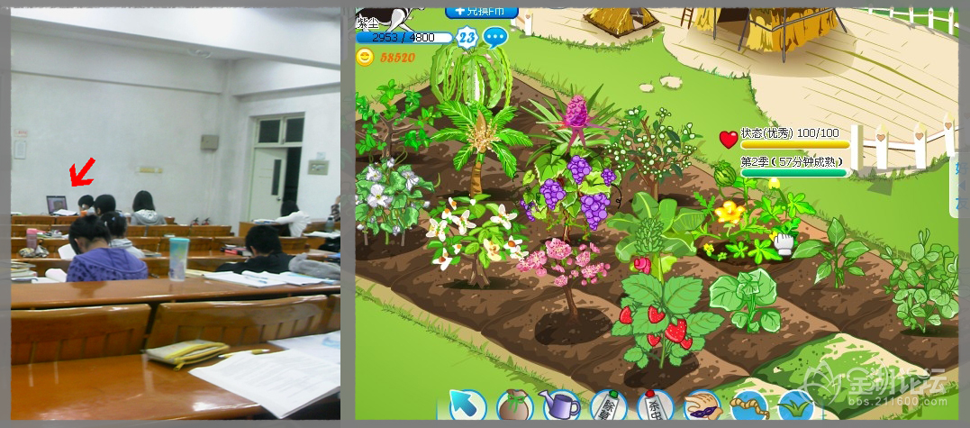 As we can see from the picture, the girl seated on the first row is absorbed in “stealing vegetables” on the QQ farm. From my own experience I could judge that she has a high level on QQ farm because she also owns a cattle farm at the same time. “Cattle farm”, which only the players with a high level can open, is also deeply welcomed by many adults. On the QQ farms there are some popular internet languages, such as: “What I plant is not radish, it is loneliness.”;“you will pay what you have stolen eventually”; “Fag away at planting nearly one year, once be stolen, life becomes days before liberation”.