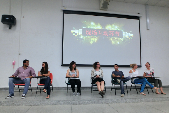 During the Q&A session, the audiences actively put forward their questions, ranging widely from study to part-time jobs and spare time plans. The international students answered the questions with humor and patience. One of the questions was: “As the topic for today is ‘Global View, New Horizon’, so what kind of global view do you think we shall bear in mind?” The international students expressed their own opinions towards this question and agreed that only with an open heart, which meant not to define and conclude too early but to explore the reasons behind, can people know more about a brand new culture. Then the international students asked different kinds of questions about the college life in China. Many Chinese students present raised their hands and answered the questions.