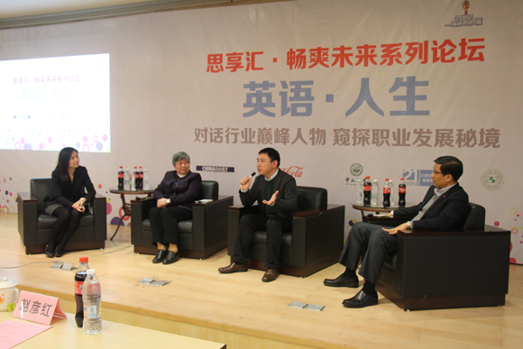 Co-sponsored by China Daily and Coca-Cola, the Forum “English·Life” on the afternoon of December 12 was hosted by Ms. Wang Lei, Vice GM of 21st Century English Education Media. Dr. Xu Dongli, Party Secretary of Faculty of Foreign Languages and International Studies, delivered an opening speech. The forum attracted more than 200 audiences by inviting three outstanding speakers, including Ms. Xu Yanan, a renowned translator and diplomat as well as former Director-general of the Department of Translation and Interpretation at Ministry of Foreign Affairs of the People's Republic of China, Mr. Zhan Cheng, Vice Dean of School of Interpretation and Translation Studies at Guangdong University of Foreign Studies, and Mr. Chen Huizhong, Chief Operating Officer of Guangdong and Fujian at Coca-Cola Greater China. The three guests had an in-depth exchange and discussion with audiences and shared their opinions and experiences about English learning, translation, job hunting as well as interview skills of UN and foreign companies, which drew a round of applause.