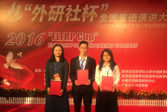 On November 5-6, 2016, the “FLTRP Cup” Uchallenge English Contests (Guangdong Province) of this year was held in Guangdong Polytechnic Normal University. Four students from Sun Yat-sen University (SYSU), winners of the campus contests, attended the contests. Three of them, Wang Zeyu (School of Geography and Planning), Zhang Mengmeng (International School of Business & Finance) and Wei Wei (School of Foreign Languages) won the grand prize in public speaking contest and writing contest, and will go to Beijing in December for the national final contest.