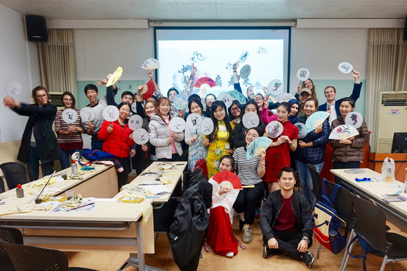 Recently, a culture salon on “Chinese fan-painting” was held in School of Foreign Languages, Sun Yat-sen University (SYSU). This salon, organized by graduate students in the Masters of Teaching Chinese to Speakers of Other Languages (MTCSOL) Program,displayed the exquisite Chinese fan-painting art by delineating Chinese painting and calligraphy. It attracted 20 international students from 15 countries including Russia, Indonesia, Korea, Greece, Thailand and Belgium, etc.