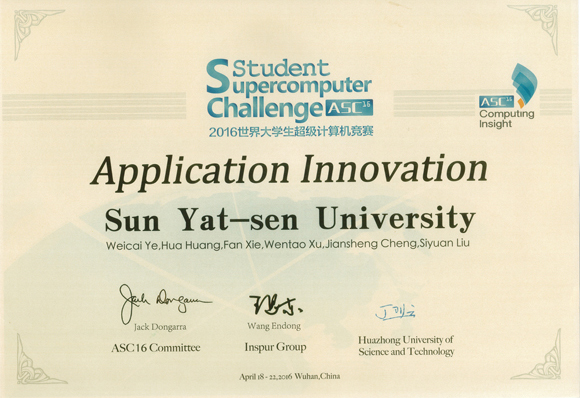 On April 22nd, 2016, Team SYSU won the First Class Award of the 2016 ASC Student Supercomputer Challenge (ASC16), the largest supercomputer contest in the world, and got the Application Innovation Award for the first time. During the competition of six applications’ optimization, Team SYSU ranked first on accelerating the de novo paired-end sequence assembling with ABySS, and second on optimizing the computation on materials science with ABINIT.