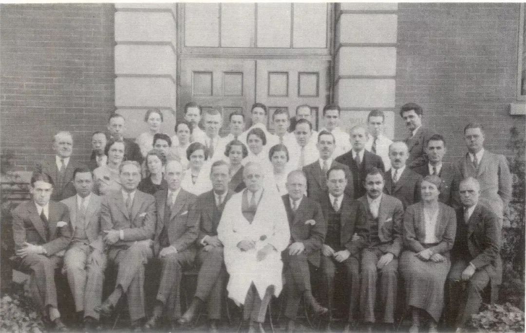 A staff photo of the Wilmer Eye Institute taken in 1932, featuring Prof. Yaozhen Chen (third row, first left).
