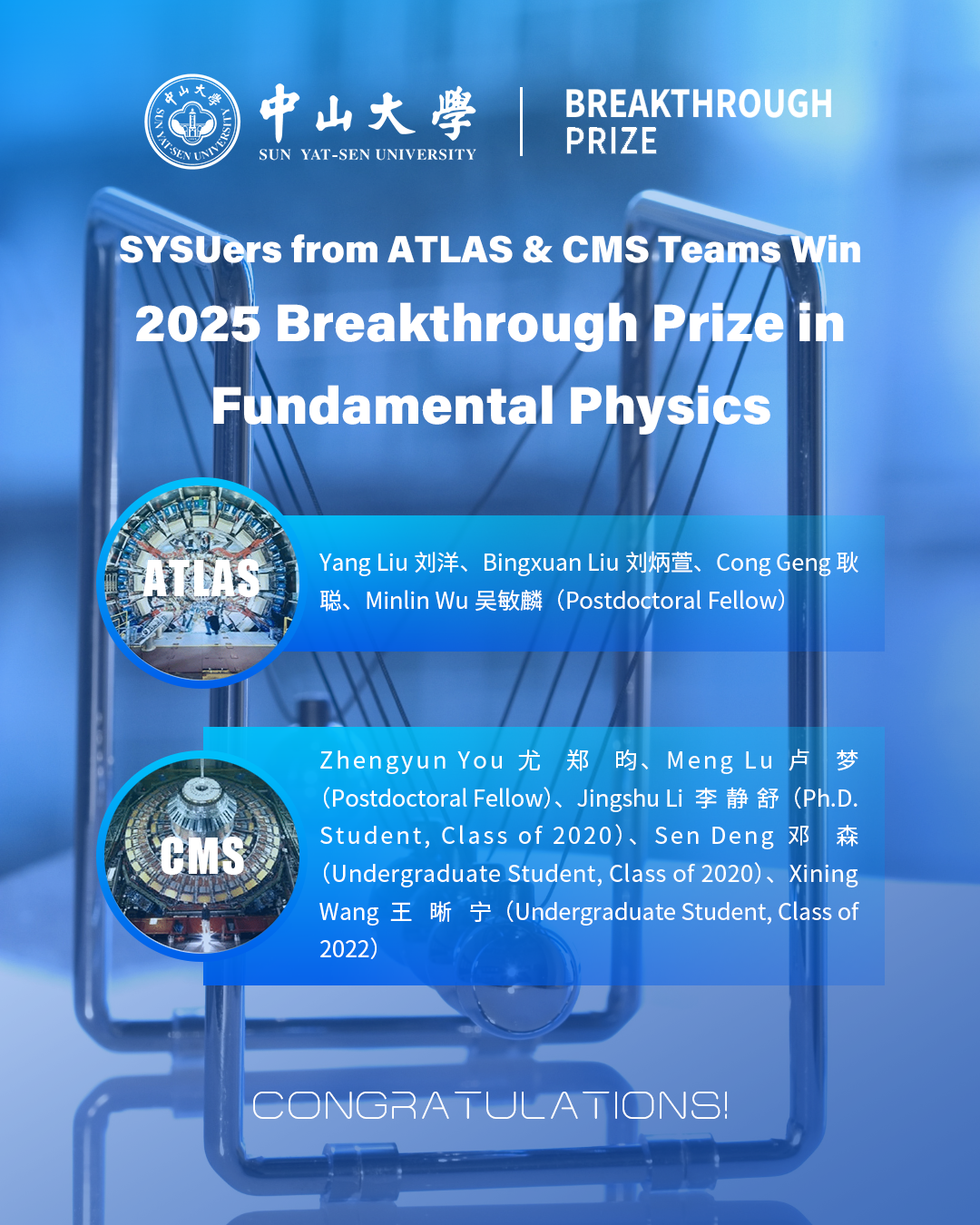 Recently, four major international experiments at CERN's Large Hadron Collider (LHC) - ATLAS, CMS, ALICE, and LHCb - have been awarded the Breakthrough Prize in Fundamental Physics. Nine faculty members, students and alumni from Sun Yat-sen University (SYSU) were listed among the award recipients for their significant contributions to the ATLAS and CMS collaborations respectively.