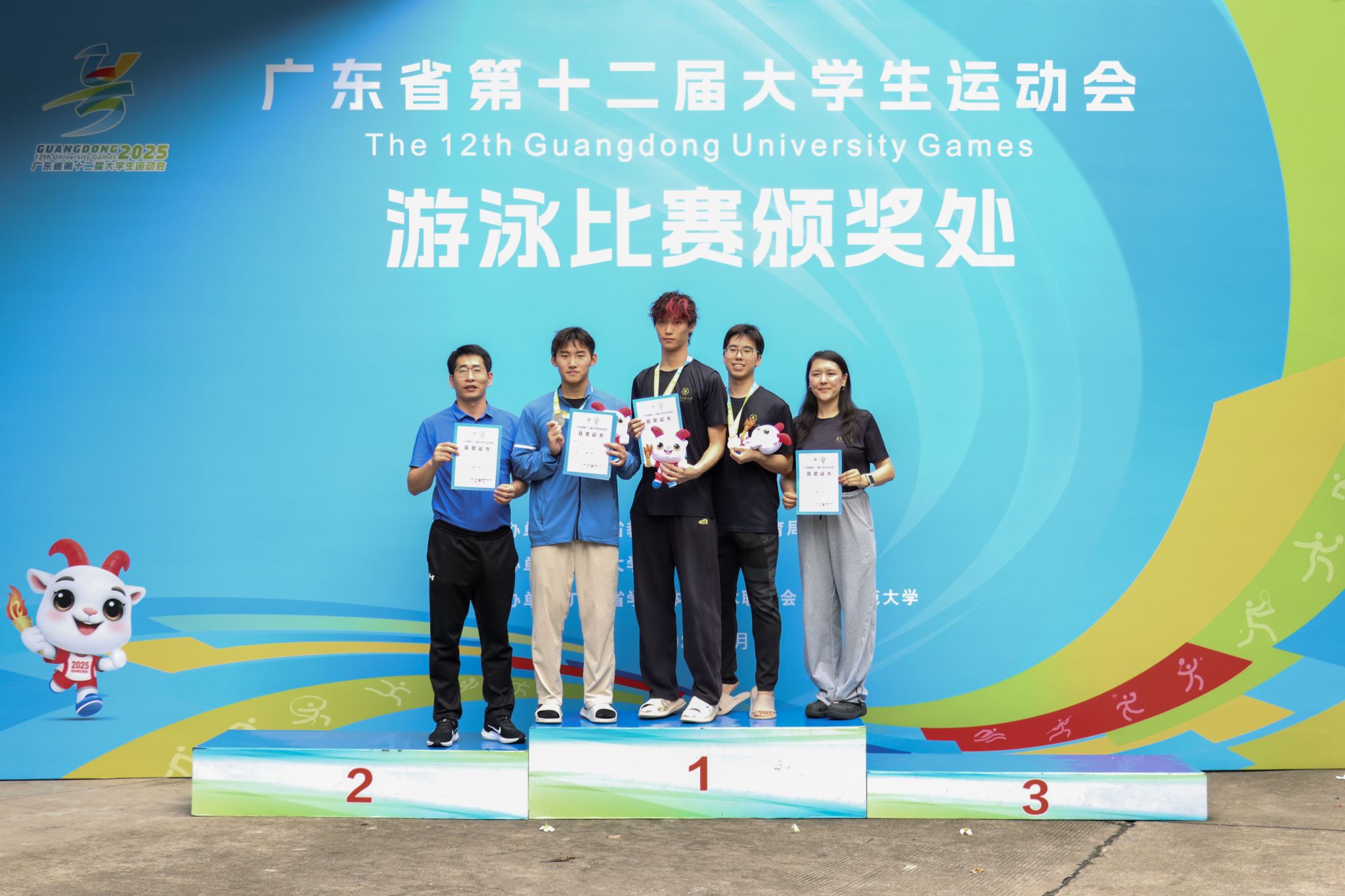 Olympic Champion and SYSU Swimming Coach Liuyang Jiao with Medal-Winning Athletes
