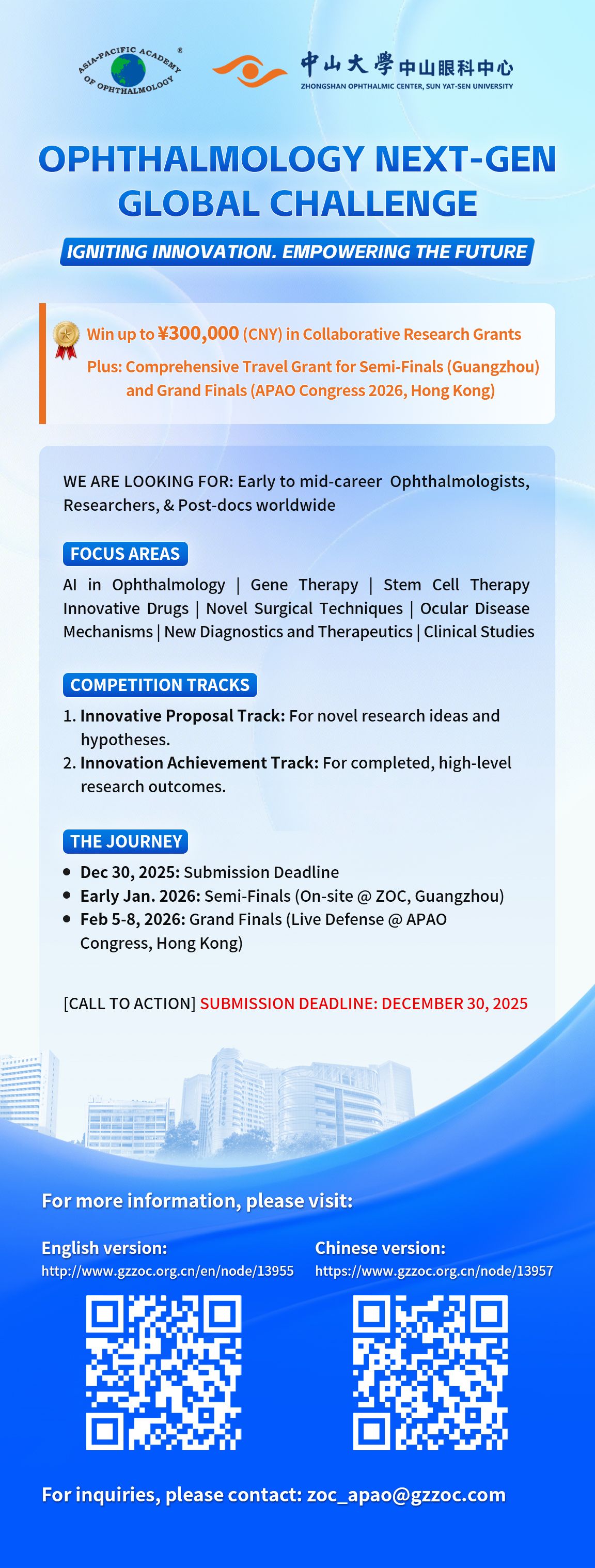 Hosted by Zhongshan Ophthalmic Center (ZOC) of Sun Yat-sen University, the Ophthalmology Next-Gen Global Challenge is now open for global submissions, aiming to identify and empower the next generation of innovators in ophthalmology.