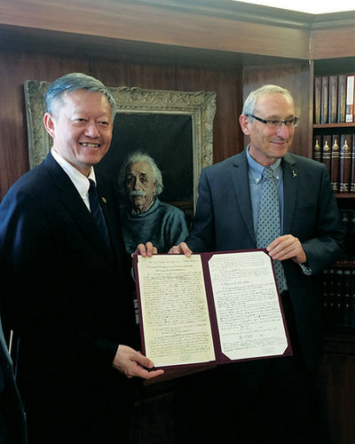 Secretary Chen Chunsheng and President Menahem Ben-Sasson holding the manuscript of Albert Einstein