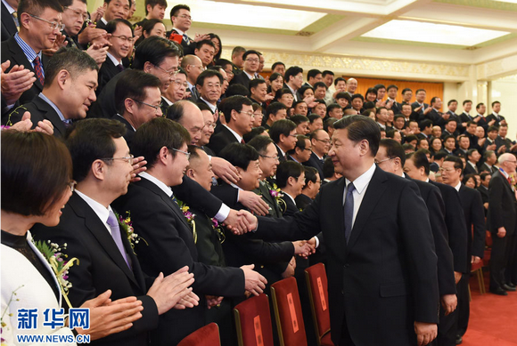 CPC and State leaders Xi Jinping, Li Keqiang, Liu Yunshan, and Zhang Gaoli meet with representatives of award winners before the Conference. (Photo by Xinhua reporter Li Xueren)