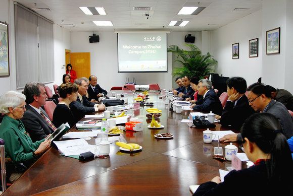 On March 14, 2015, a 7-member delegation led by Dr. Donald Blackketter, Chancellor of Montana Tech of The University of Montana, visited Zhuhai Campus of Sun Yat-sen University (SYSU). Prof. Ma Jun, Vice President of SYSU, met with the guests, accompanied by Prof. Zhang Ke, Dean of School of Earth Science and Geological Engineering, and Ms. Xu Yao, Deputy Director of Office of International Cooperation & Exchange.