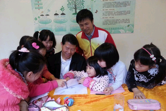 Secretary-General Chen Guo, accompanied by He Liping, draws pictures with children at the Children’s Activity Room