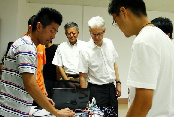 Accompanied by Prof. Chen Chunsheng, Prof. Ian White visited the School of Mobile Information Engineering (SMIE) at SYSU. Prof. Li Wenjun, Dean of SMIE, and Prof. Yang Ran, Deputy Dean of SMIE, introduced the educational philosophy and basic situation of SMIE. Prof. Ian White talked with the students and learned about their works in engineering practice.