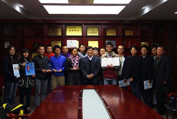 On the morning of December 16, President Xu Ningsheng came to School of Life Sciences to visit the student and instructor representatives of SYSU teams for iGEM 2013. Zhao Haoquan and Sun Mengyi, senior students from School of Life Sciences, displayed the works of SYSU-Software and SYSU-China respectively, and explained in fluent English the ideas, experiments, designs and results of their projects. Members of the two teams showed their trophies and presented self-made iGEM postcards to President Xu Ningsheng. As instructor representatives, Prof. He Xionglei from School of Life Sciences and Senior Lecturer Zhang Yongdong from School of Mathematics and Computational Science introduced their experience in instructing the students.