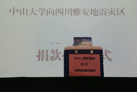 The whole ceremony was brief and solemn. First, all teachers and students present stood for a minute in silence to mourn the victims of the April 20 Ya’an earthquake. Then, Yu Shiyou, Deputy Secretary of SYSU Party Committee, Secretary of Discipline Inspection Commission of SYSU and Chairman of SYSU Labor Union, introduced the series of activities by SYSU faculty, staff and students in response to the earthquake, and called on everyone to support the rescue and reconstruction work with practical actions. Guangzhou Zhongda Medical Equipment Co., Ltd, a company under the Industry Group of SYSU, donated 1 million yuan worth of “Shen Qiao” — the latest high-tech medicine for the repair of nerve defect, to be used by Huaxi Hospital of Sichuan University in the treatment of those who are injured in the earthquake.